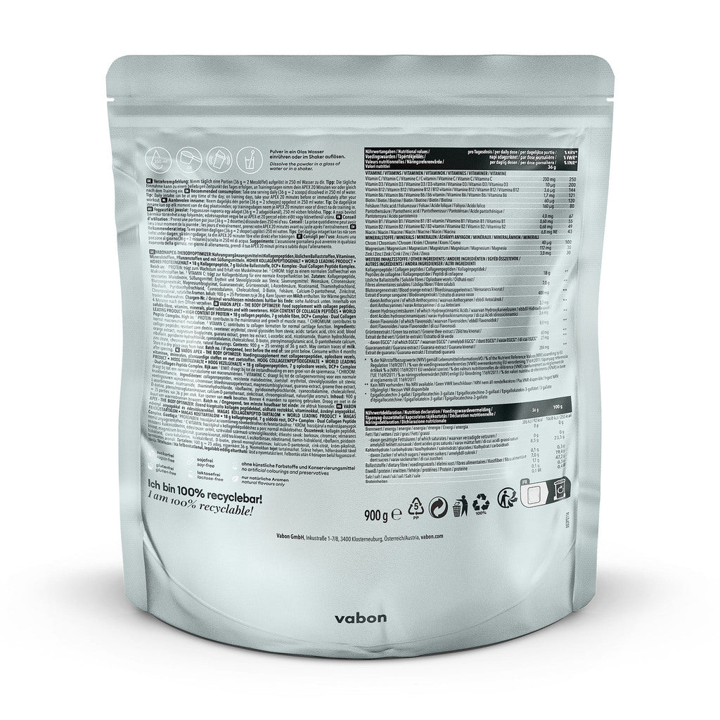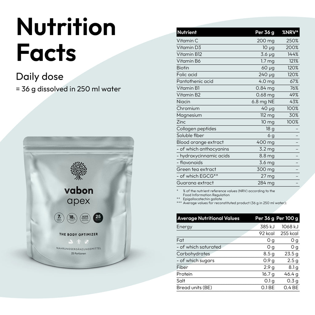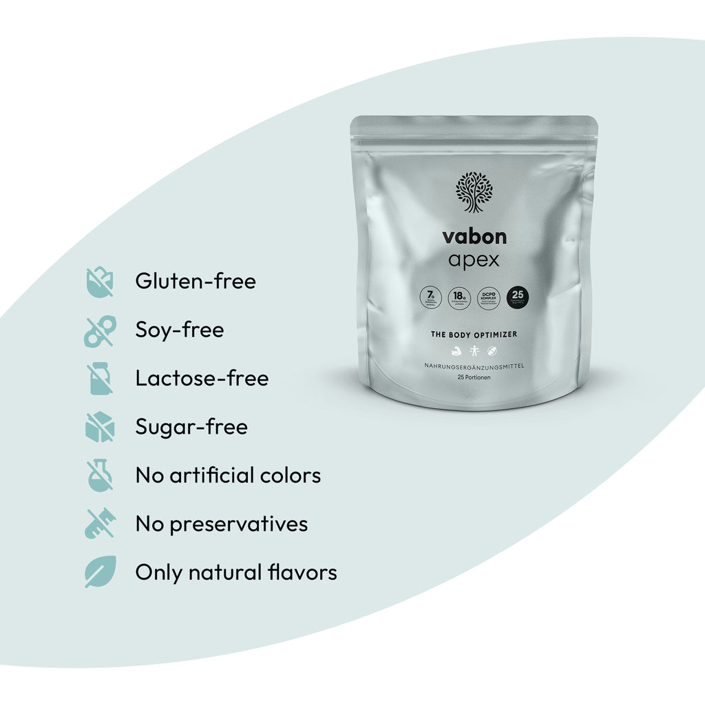 Viele Nährstoffe wirken in spezifischen Körpersystemen zusammen und entfalten ihre volle Wirkung nur in einer umfassenden Kombination. Bei vabon apex setzen wir auf eine ganzheitliche Versorgung mit hochwertigen Kollagenpeptiden, löslichen Ballaststoffen, Vitaminen, Mineralstoffen, Pflanzenstoffen und Spurenelementen. Diese Zusammensetzung unterstützt den Körper optimal in seinen sportlichen Herausforderungen und fördert gezielt Muskelaufbau, Fettabbau und die Gesundheit von Gelenken und Bindegewebe.