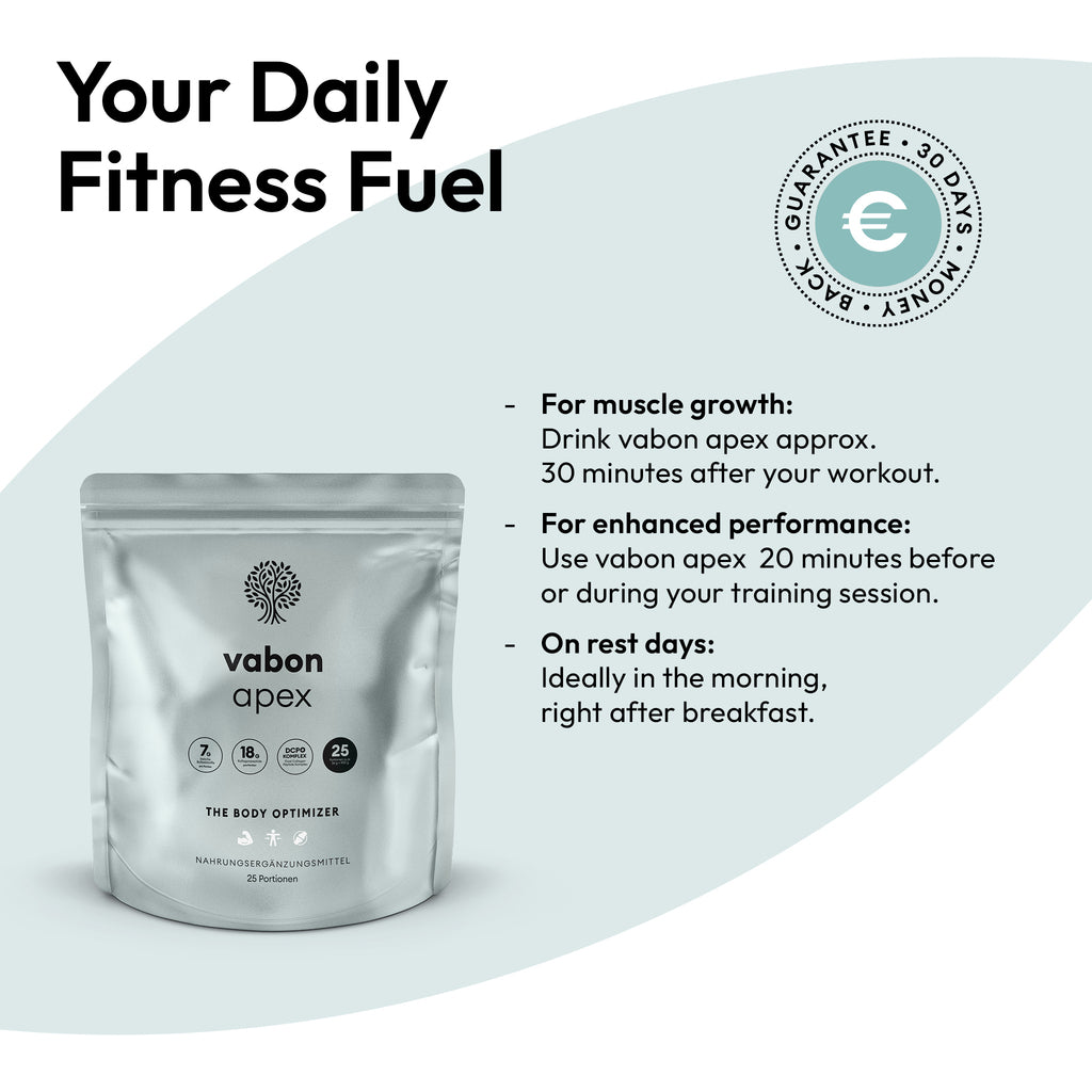 Für maximale Wirkung empfiehlt es sich, vabon apex direkt vor dem Training einzunehmen – so profitierst du optimal von der extra Portion Energie und Durchhaltevermögen.