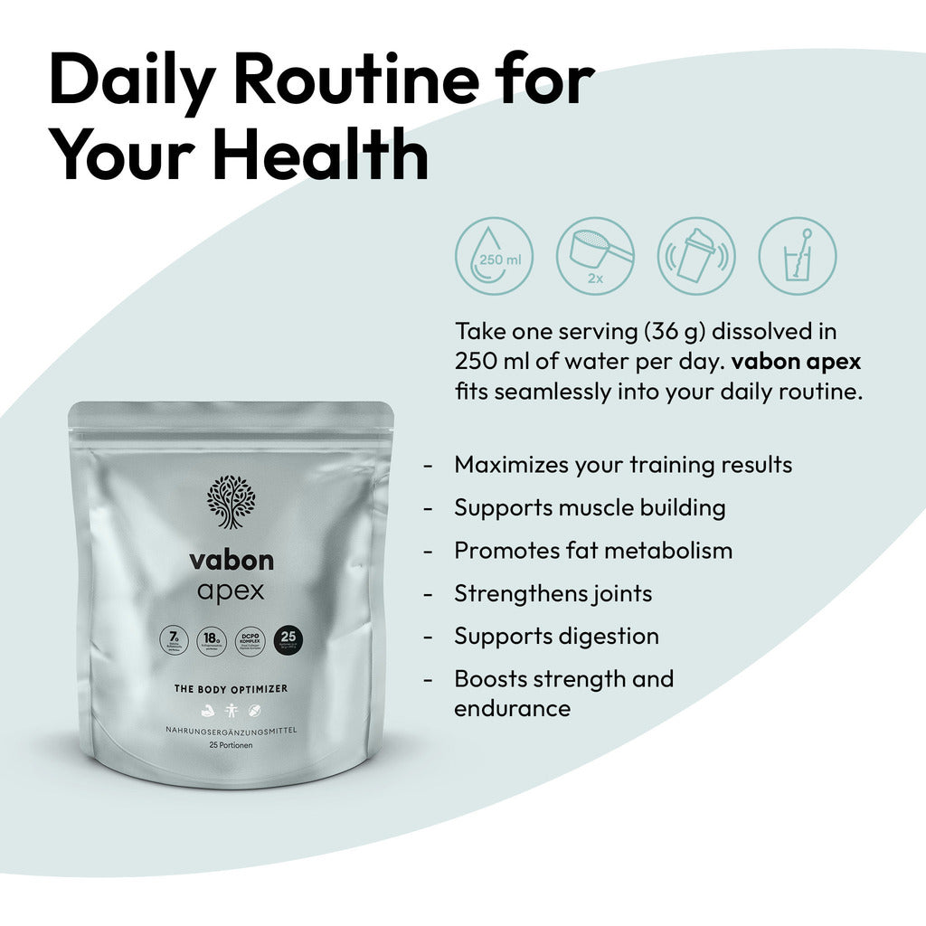 Alles in einem macht es nicht nur günstiger, sondern auch angenehmer und realistischer, dein Vorhaben in die Tat umzusetzen. Mit vabon apex wird deine tägliche sportliche Routine vereinfacht. Eine einzige Dosis täglich reicht aus, um deinen Muskelaufbau, Fettabbau, deine Gelenke, Verdauung, Bindegewebe, mehr Ausdauer & Kraft zu unterstützen. Natürlich alles in Kombination mit Bewegung.