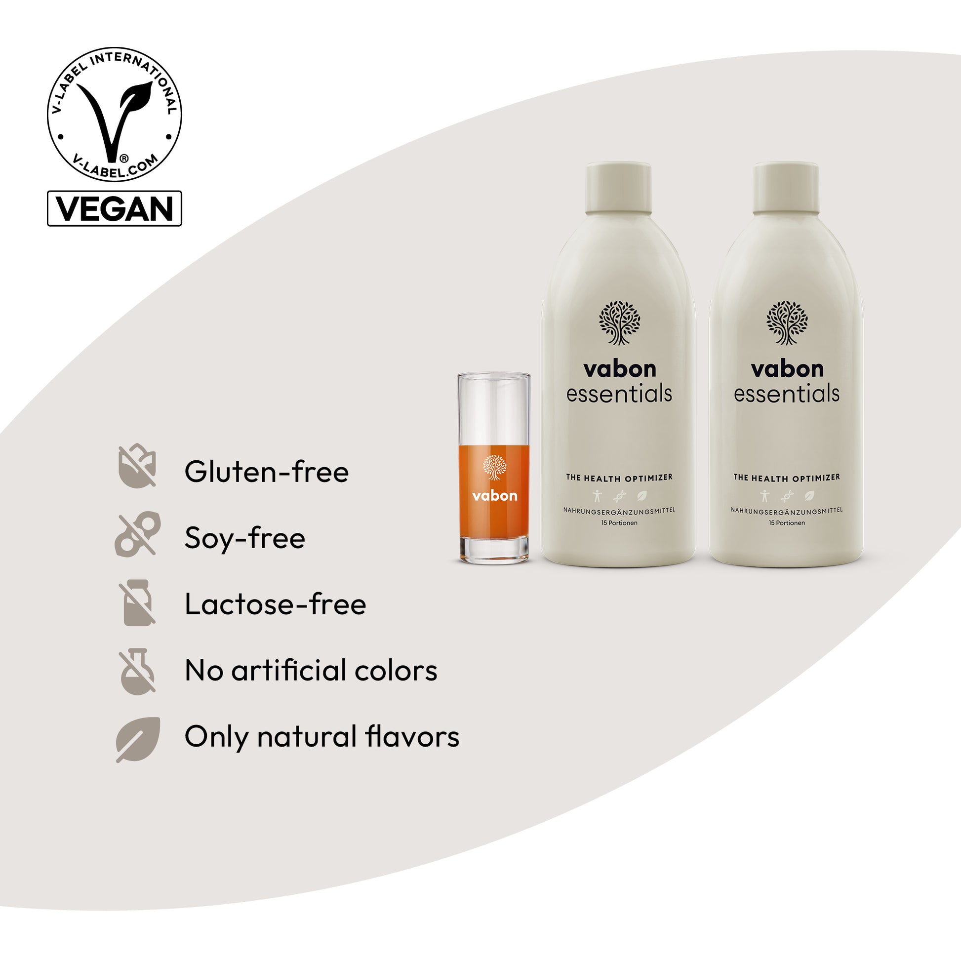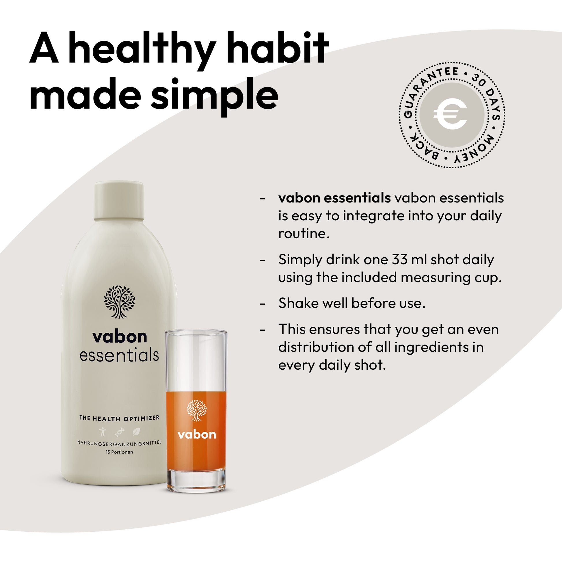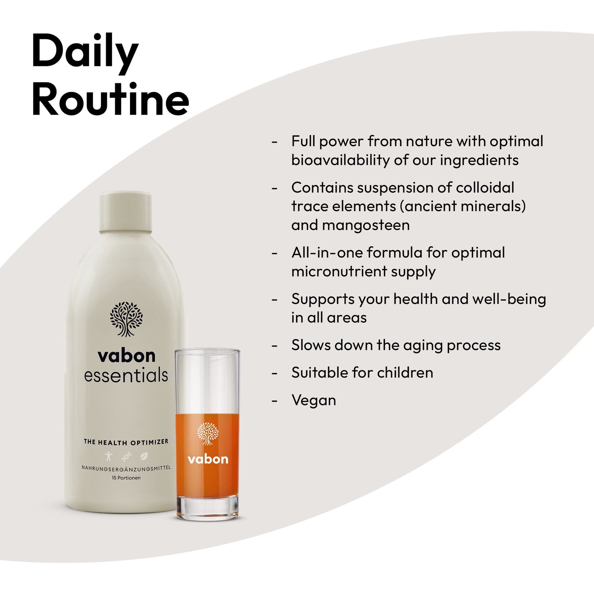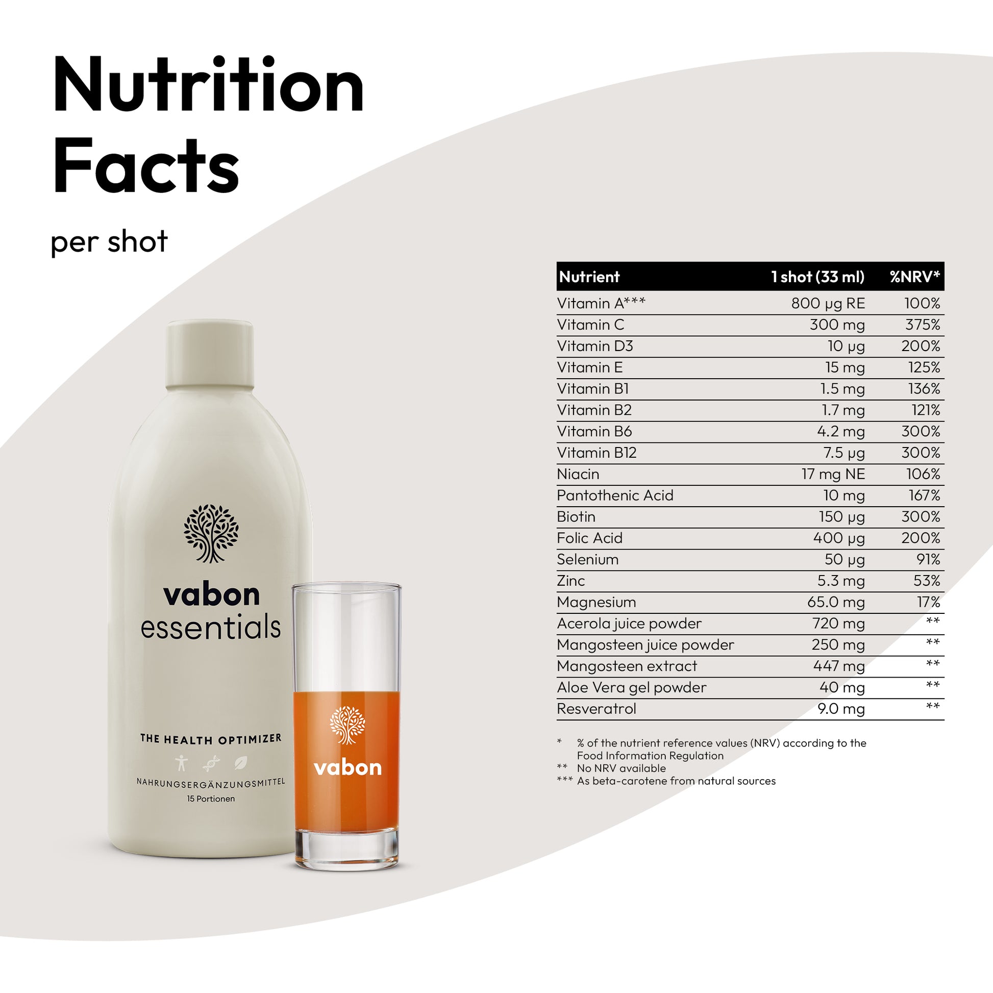 Più salute? Rallentare il processo di invecchiamento? Più energia e vitalità? Qualunque sia il tuo desiderio – vabon essentials ti supporta. 33 ml coprono il 100% e oltre del fabbisogno giornaliero di 12 vitamine e contengono minerali e oligoelementi naturali oltre a un potente fitococktail di preziose sostanze vegetali.